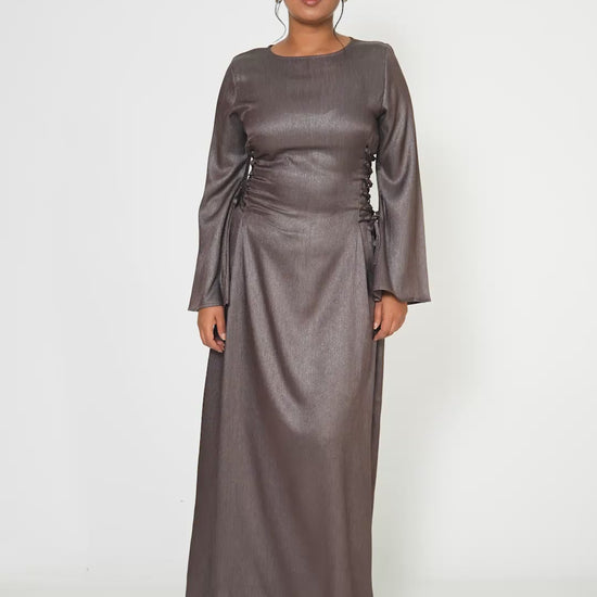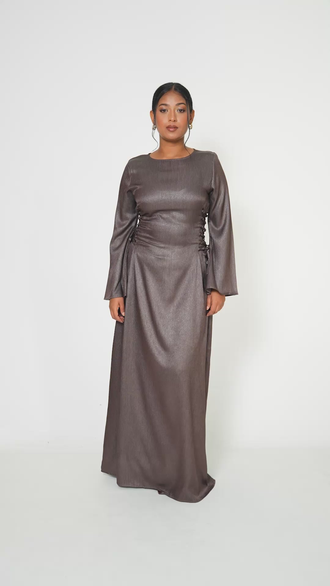 The model is usually a UK10. She's wearing UK12 in the pictures. It is recommended to go one size larger than your usual size for this item. For example, if you usually wear UK8, we recommend going for UK10 for this outfit to comfortably tie up the laces on the sides