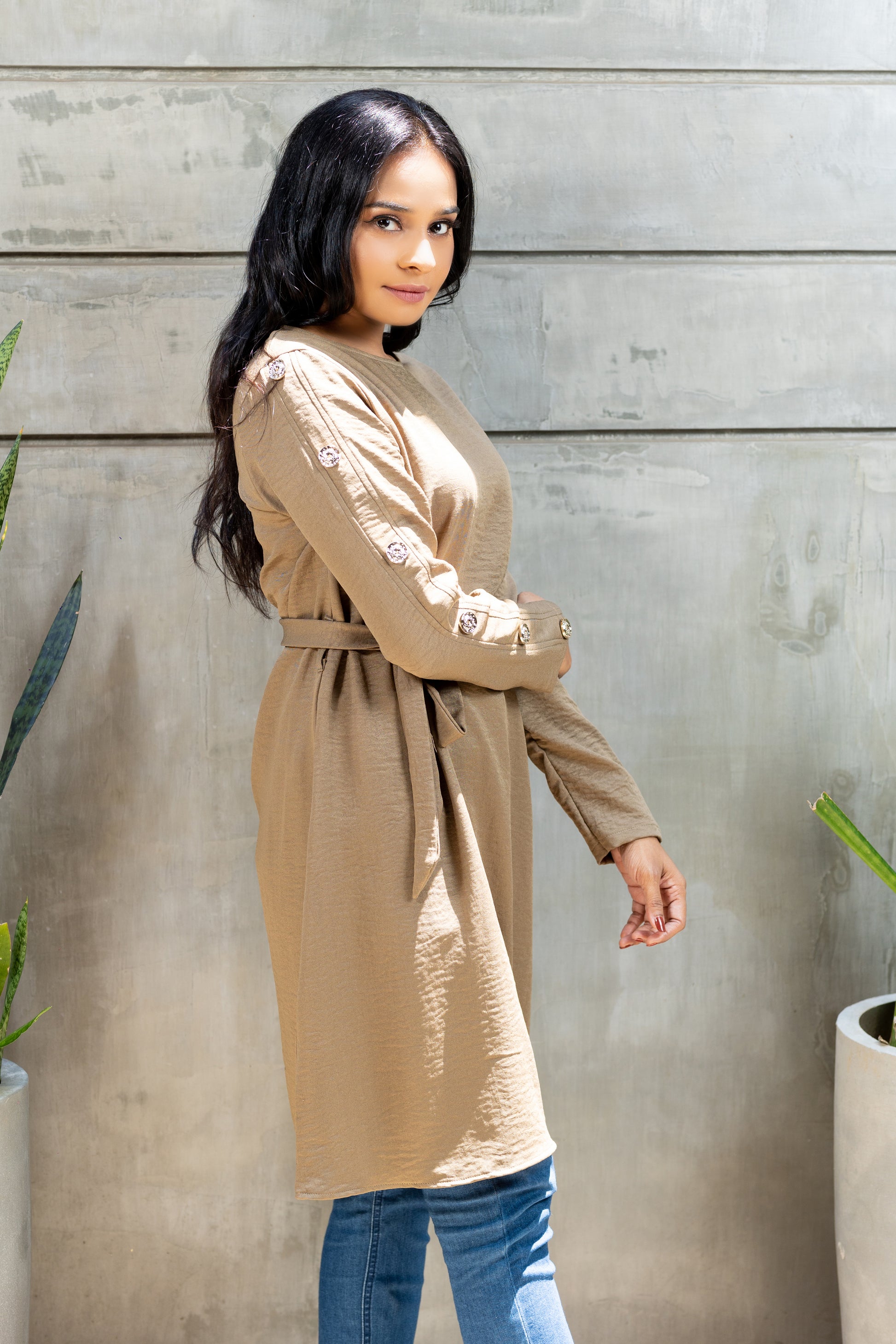 Button sleeve short top. Greyish brown coloured. CEY fabric. 37 inches in length