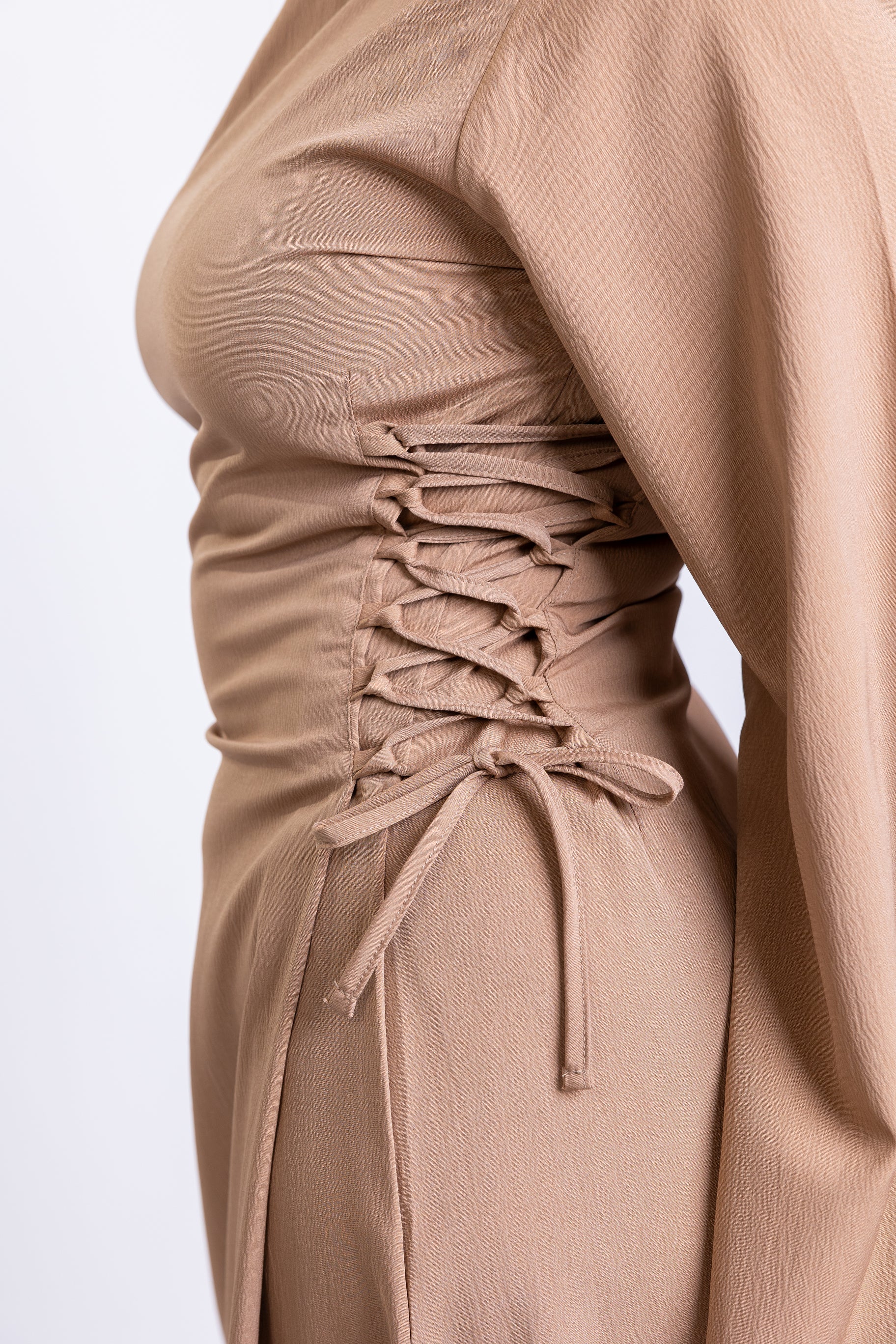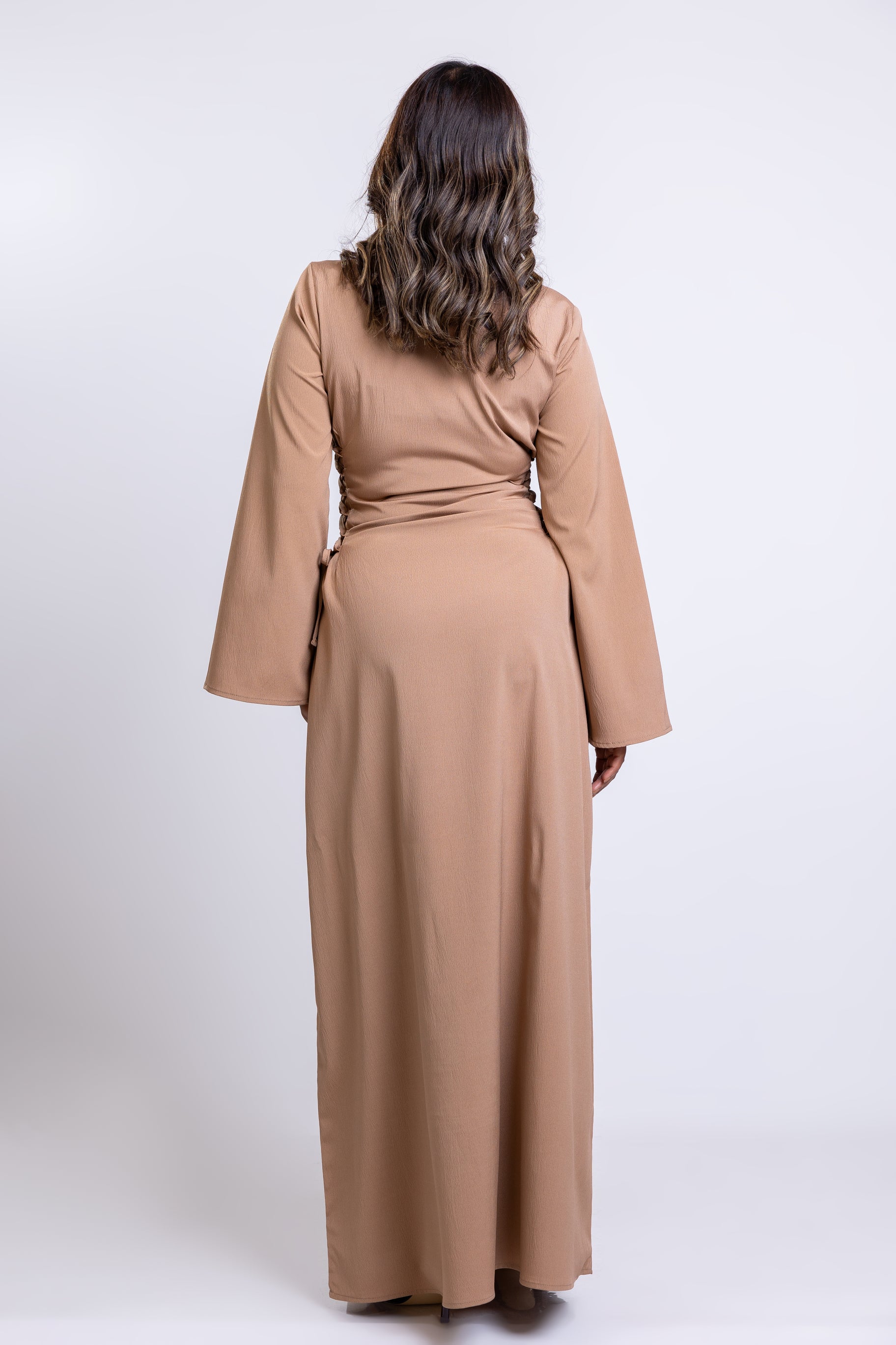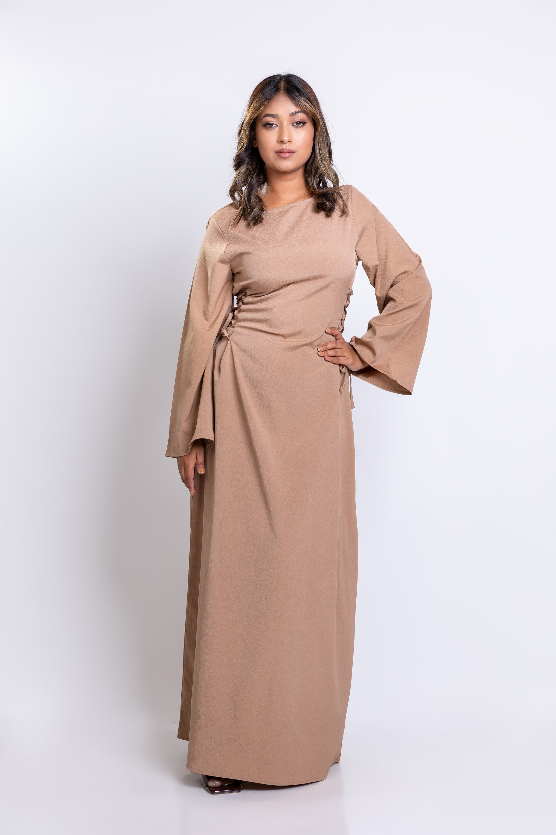 Coffee brown shade dress with side lace-up. 57 inches in length. Crepe fabric