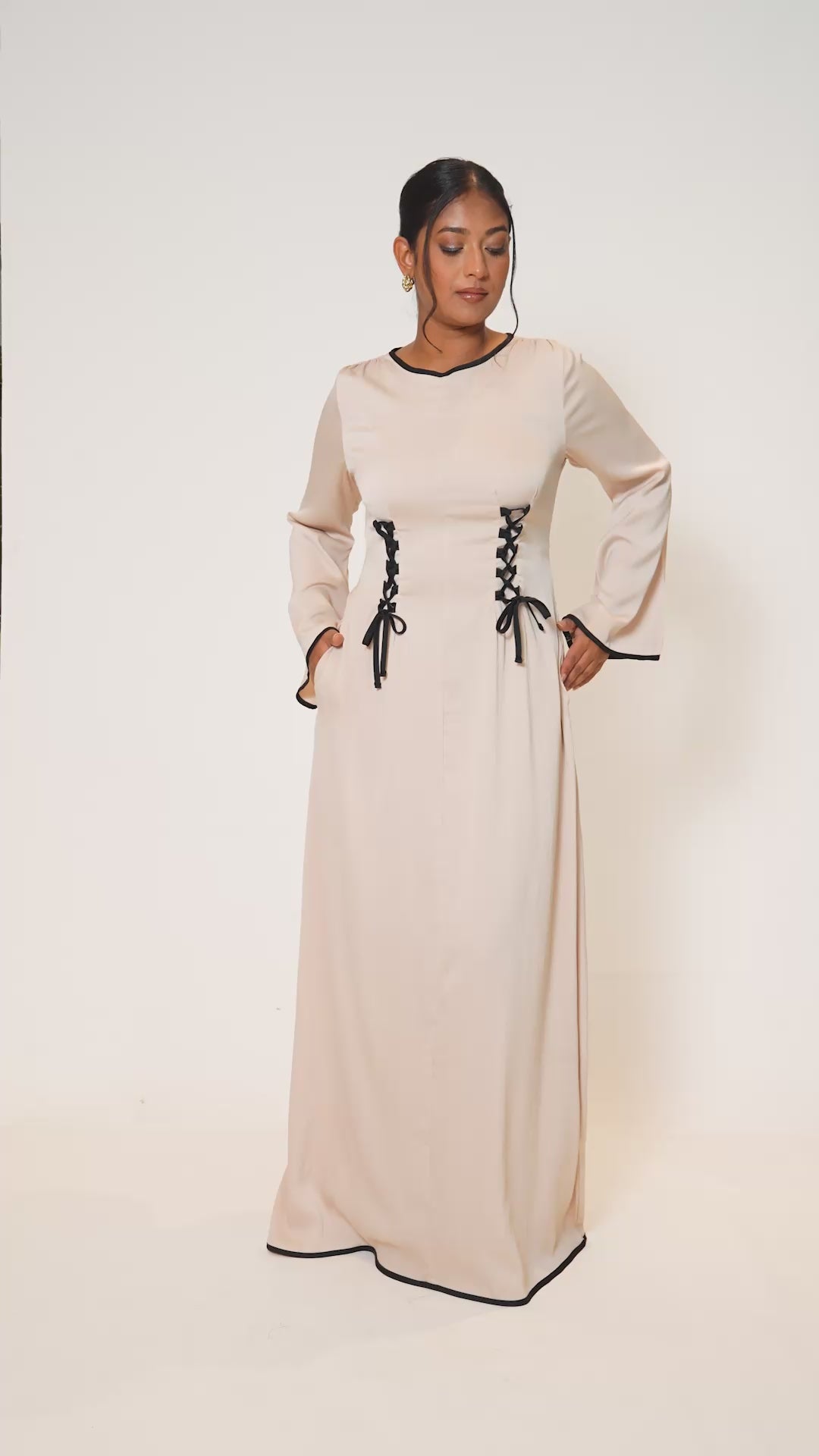 Long flowy modest dress. This dress has pockets. 57 inches in length. Black lace detailing in the neckline, sleeves and hem and a 3-point joint belt at the back