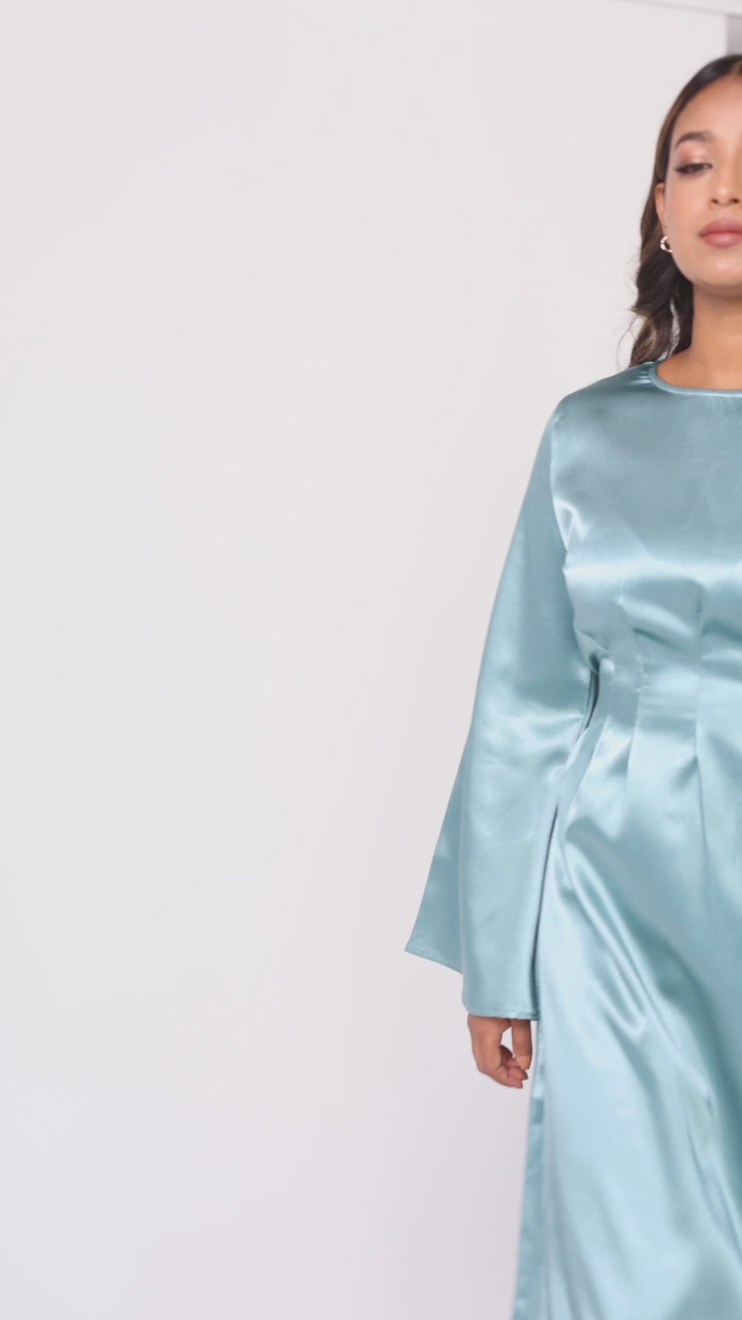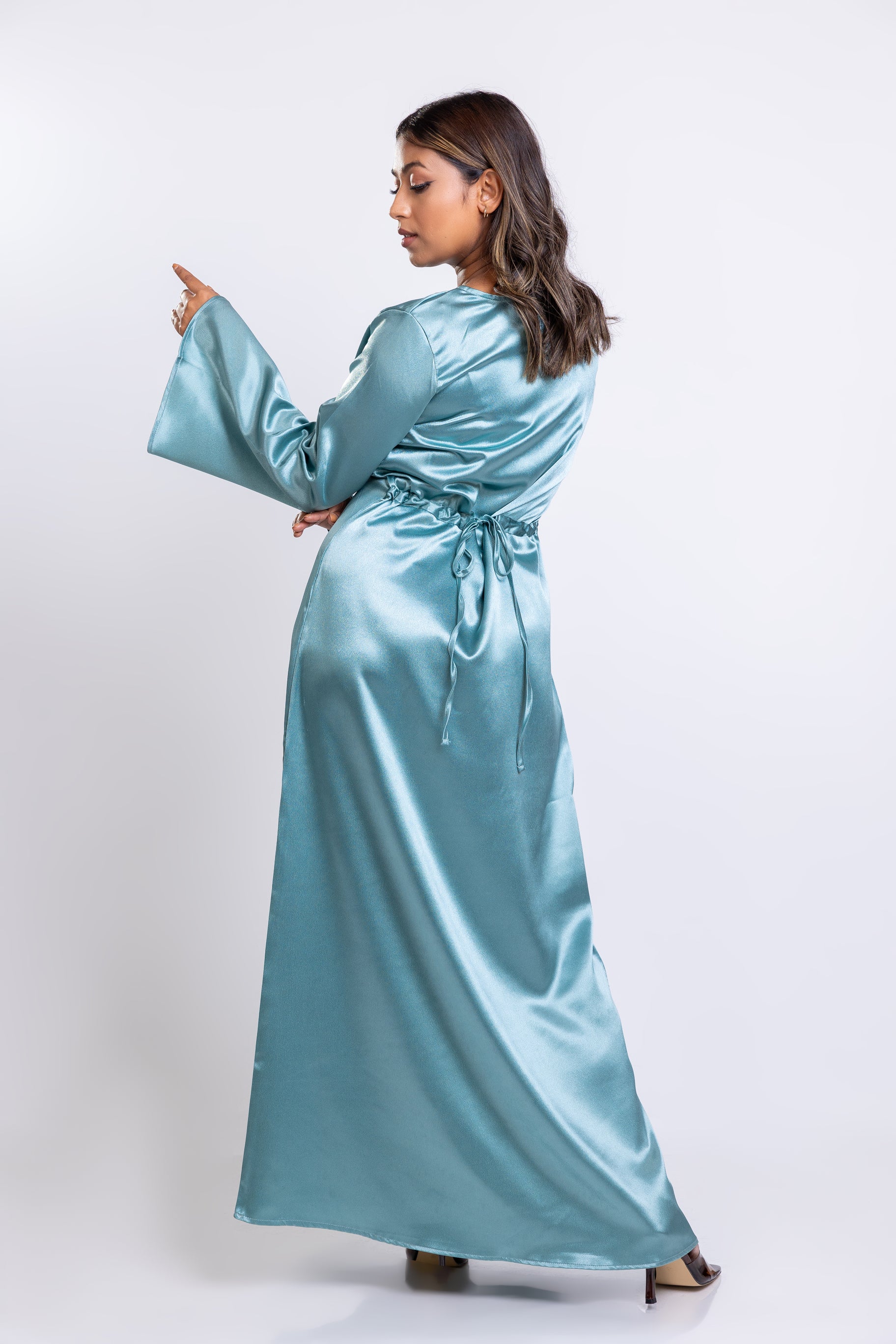 Long silvery-cyan blue satin dress with side lace-up. 57 inches in length. Satin fabric With a belt at the back to adjust waist size
