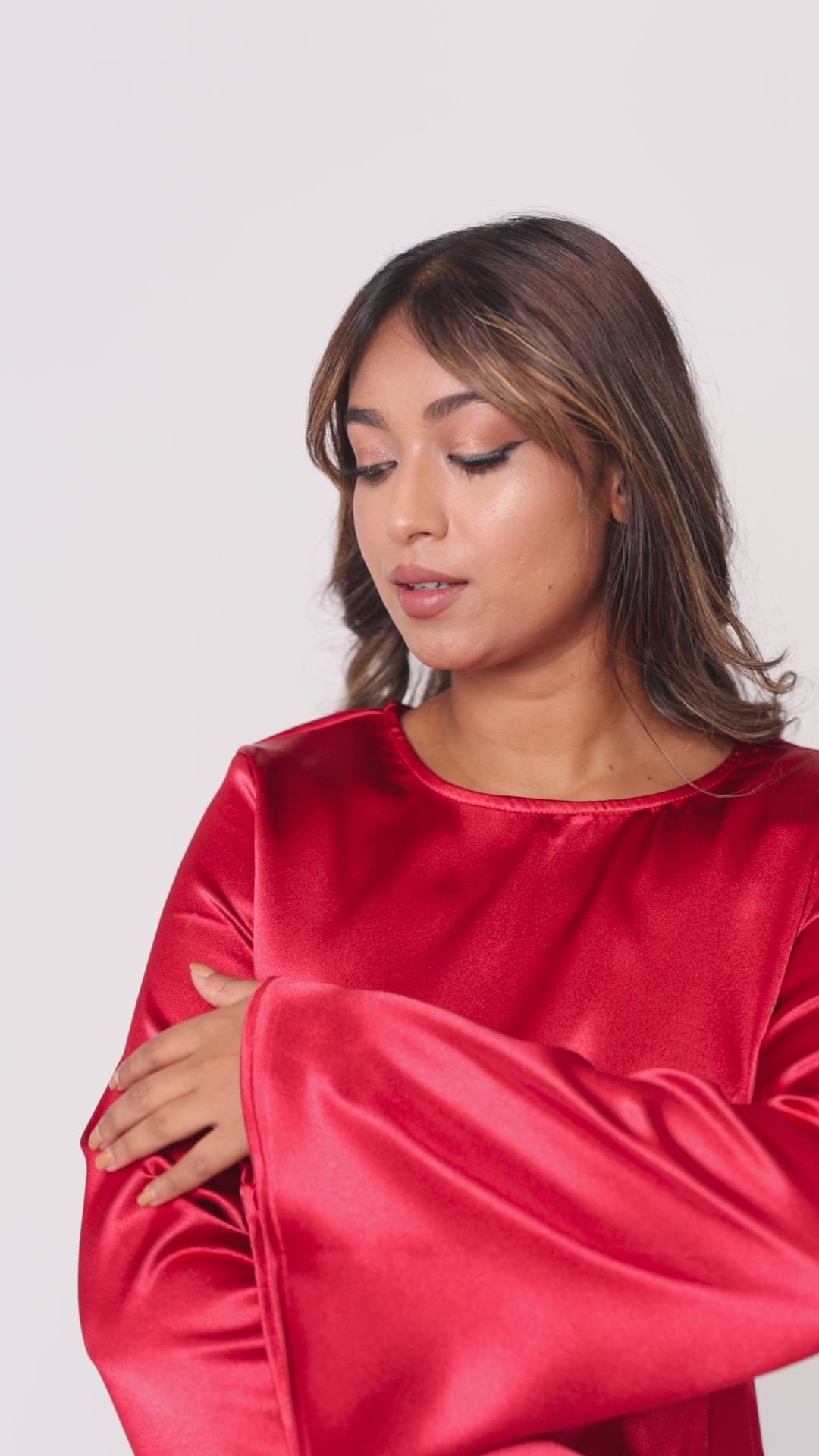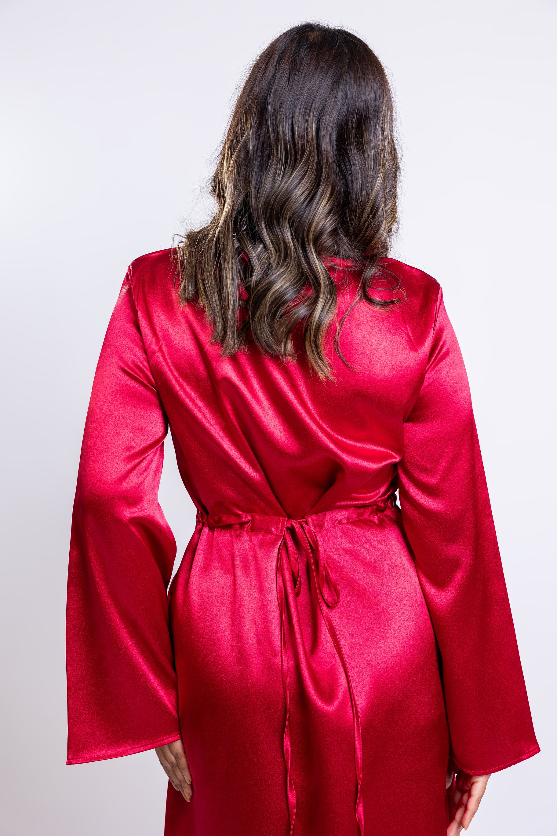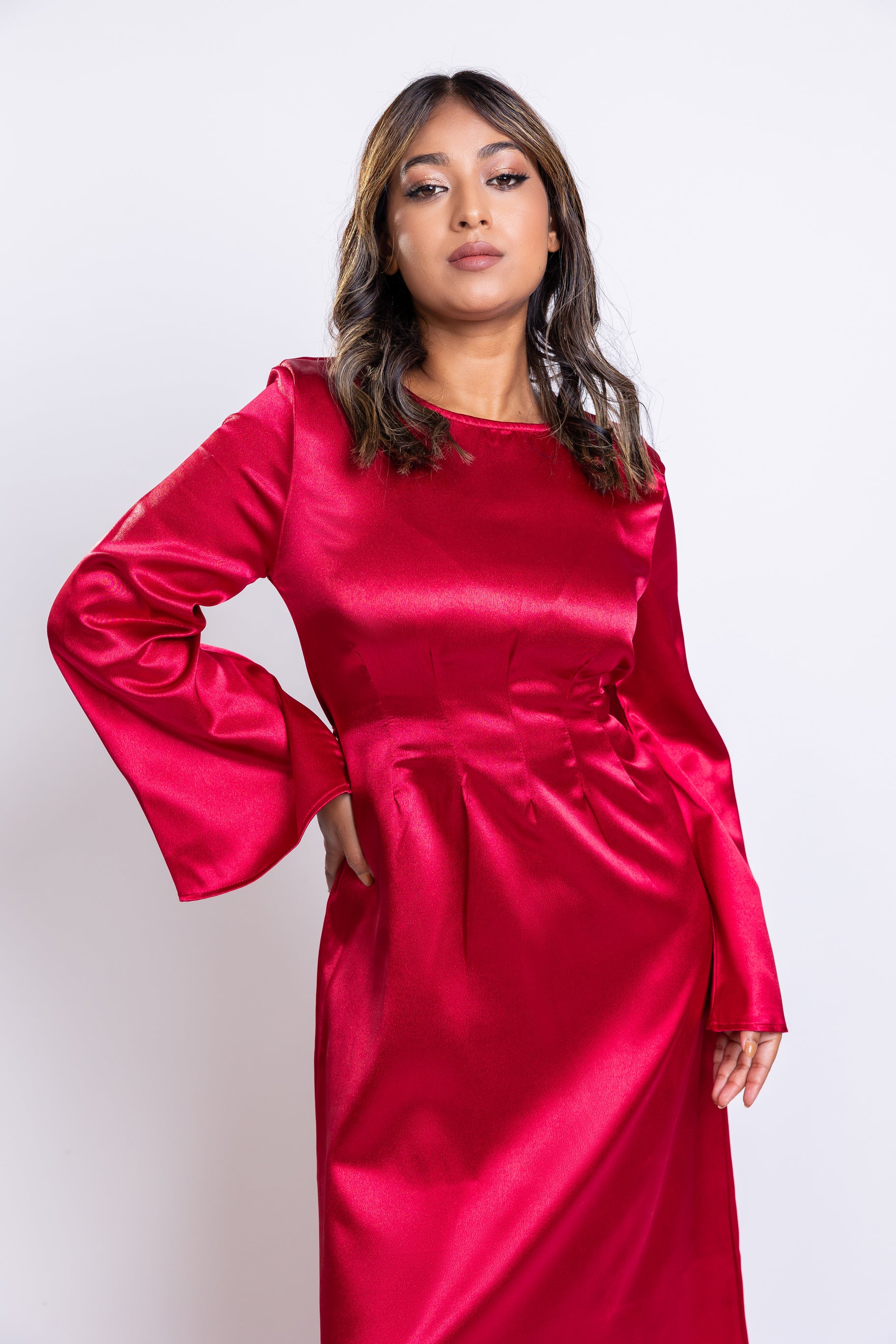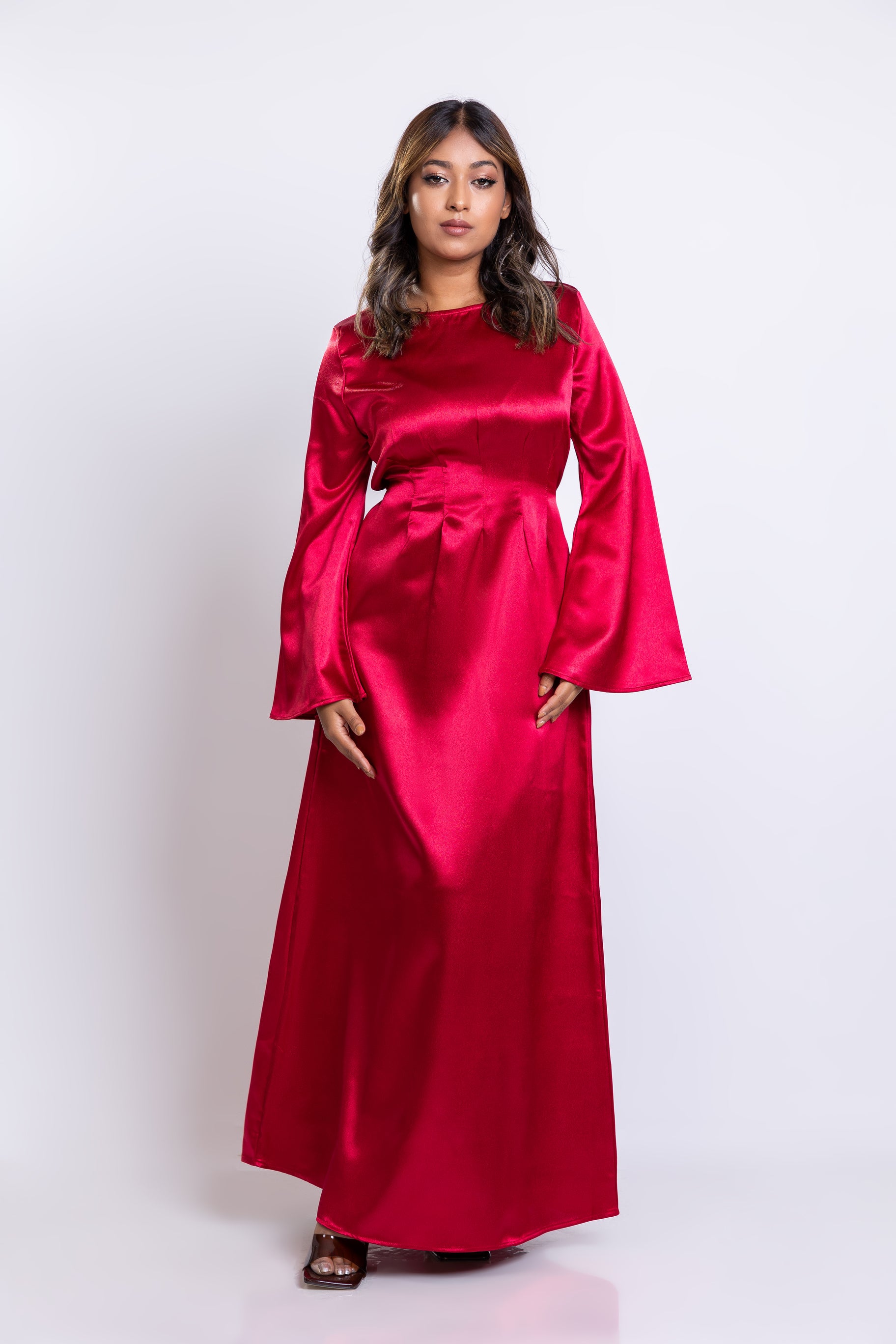 Long Deep red satin dress with side lace-up. 57 inches in length. Satin fabric With a belt at the back to adjust waist size