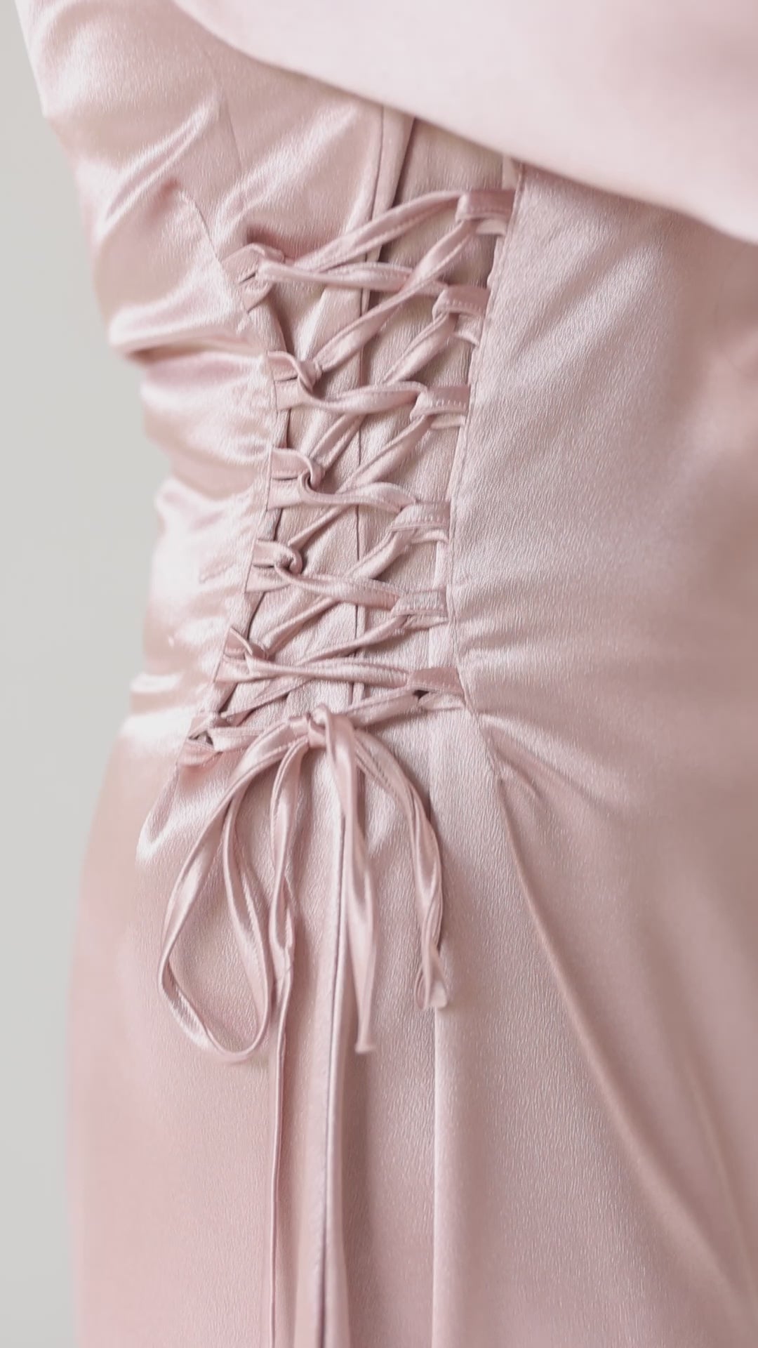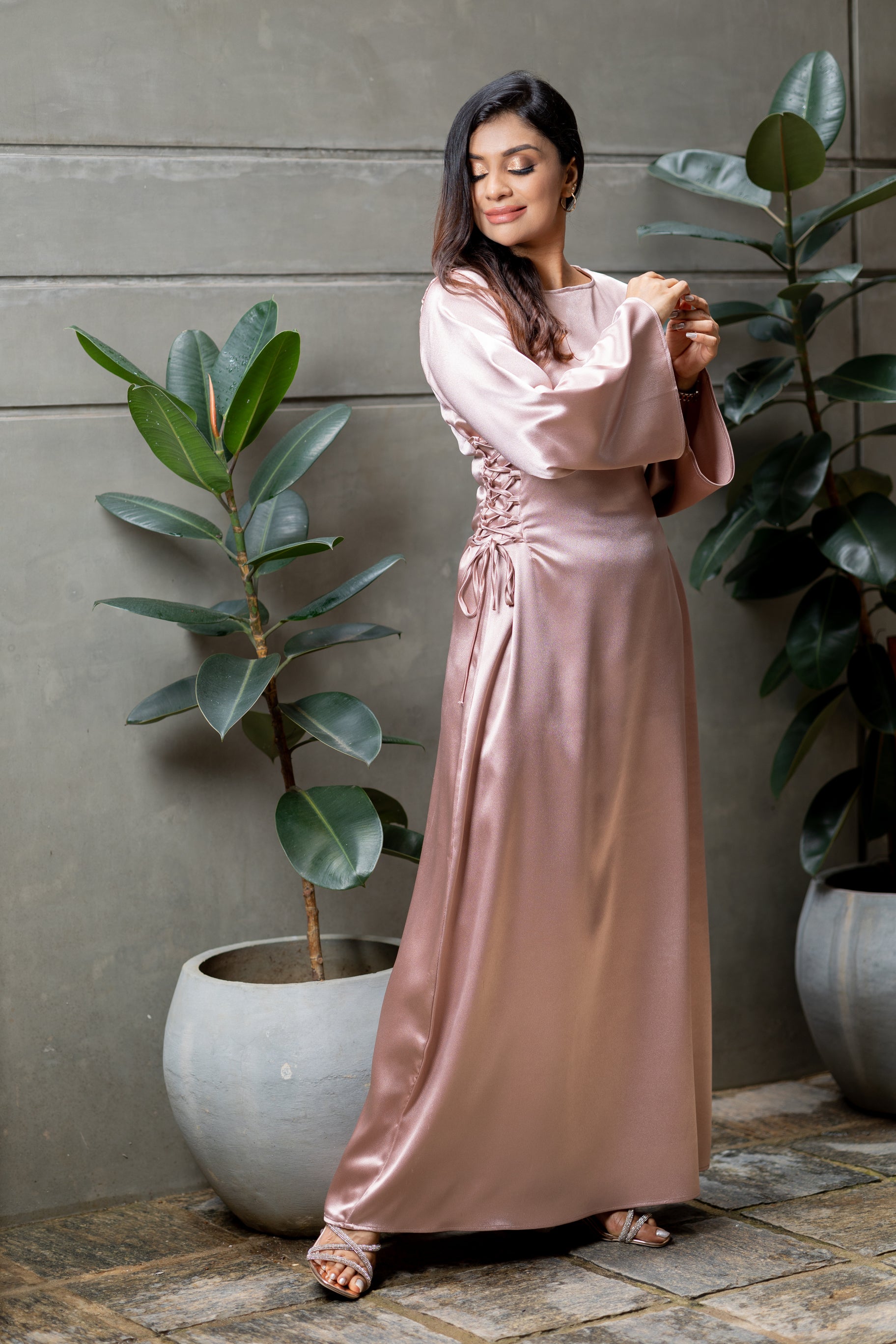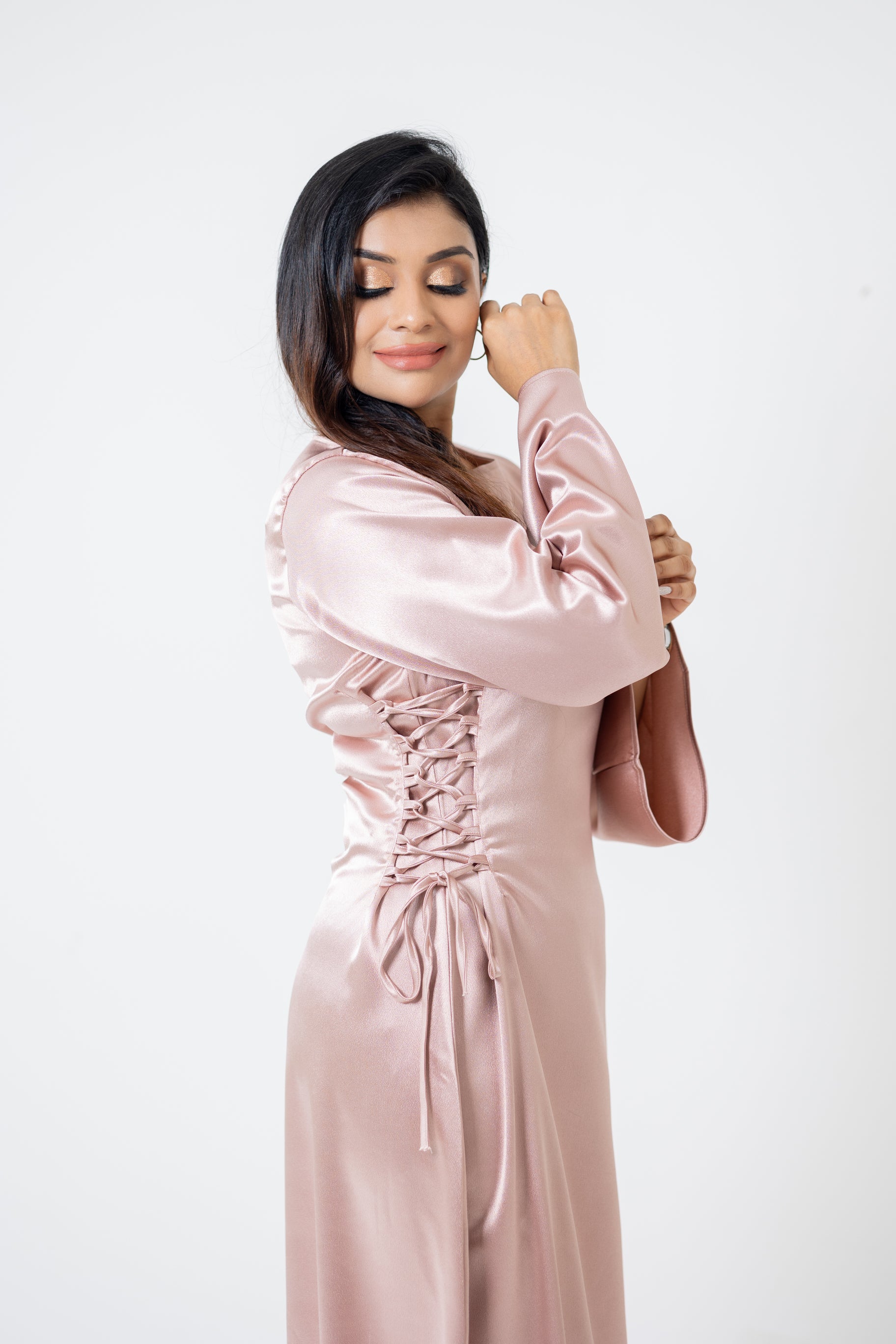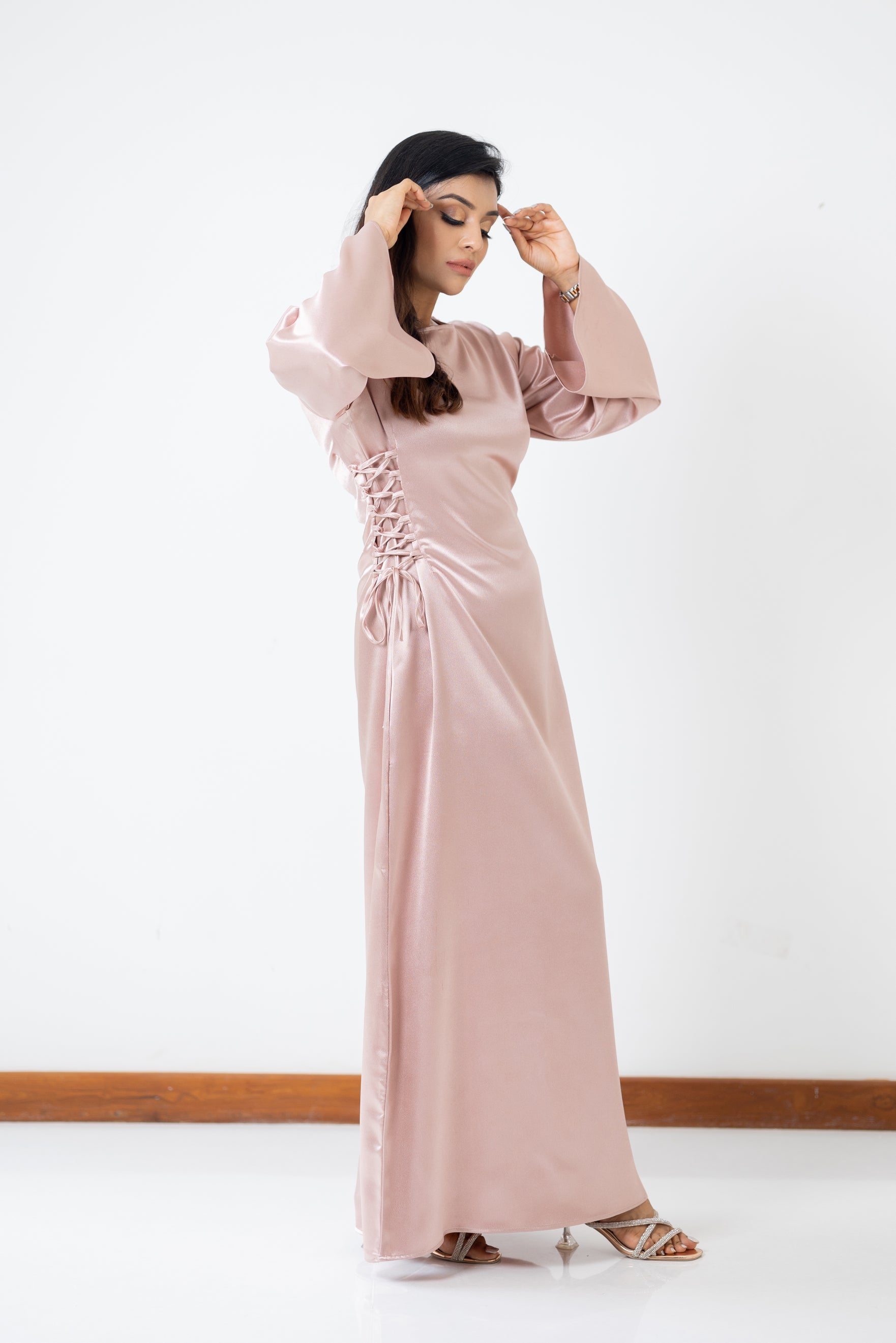 Long dusty pink shade dress with side lace-up. 57 inches in length. Satin fabric