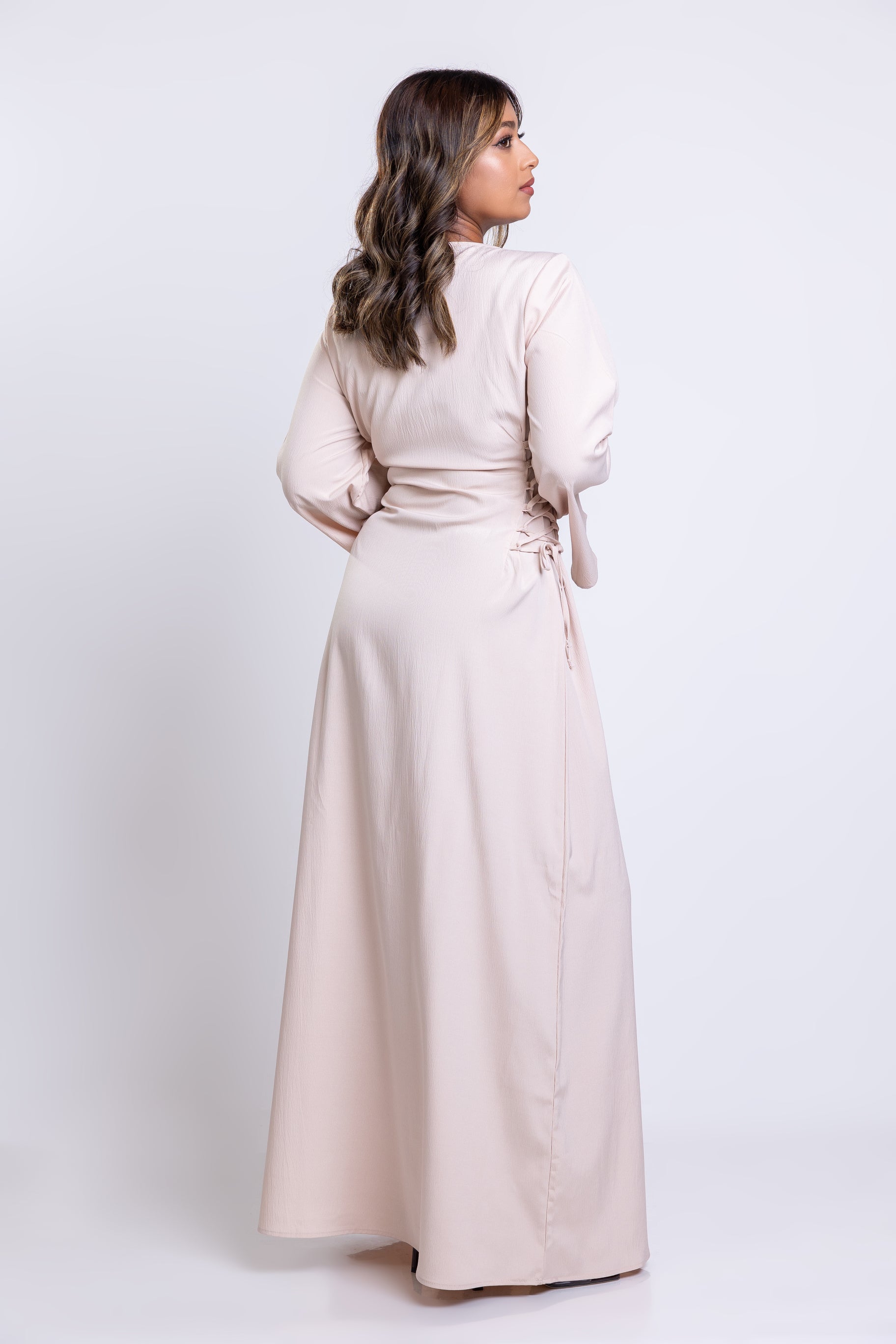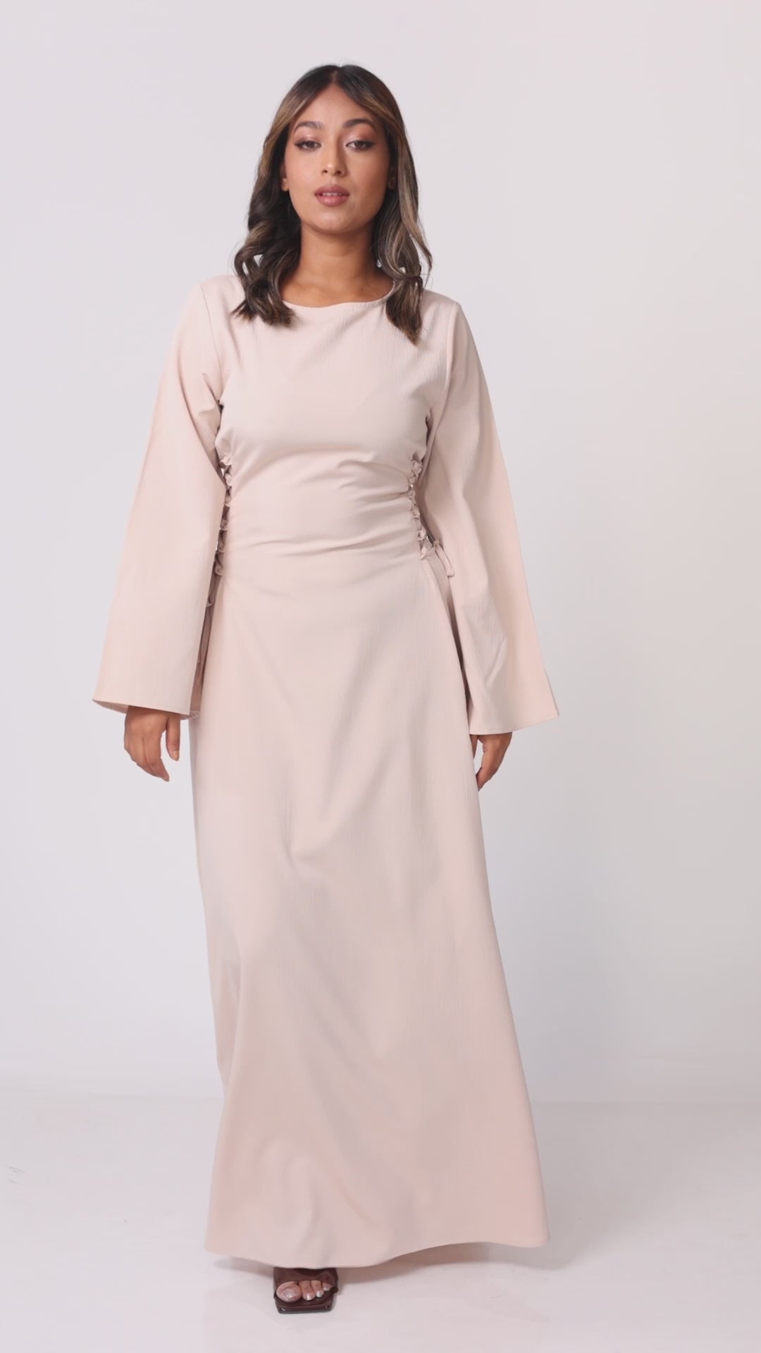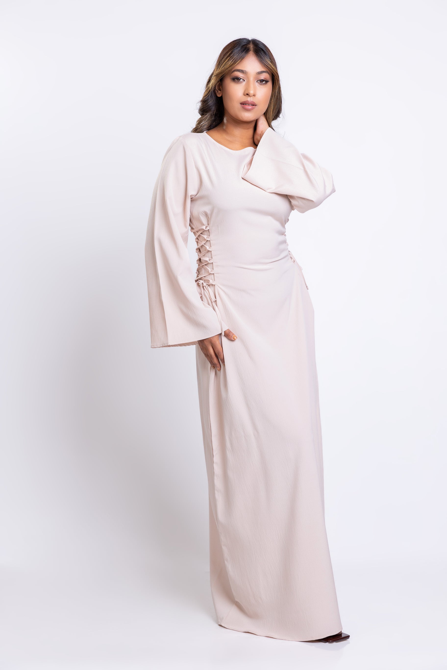 Ivory-beige shade dress with side lace-up. 57 inches in length. Crepe fabric