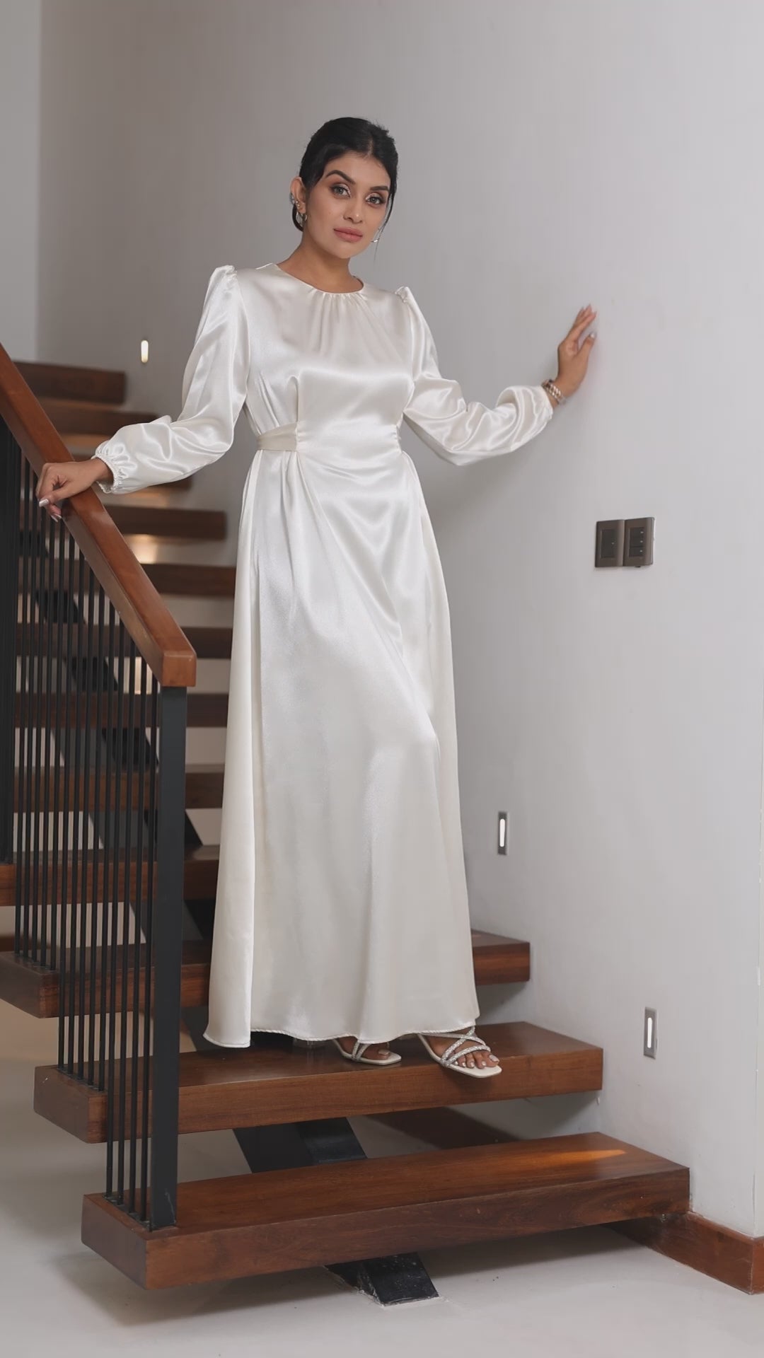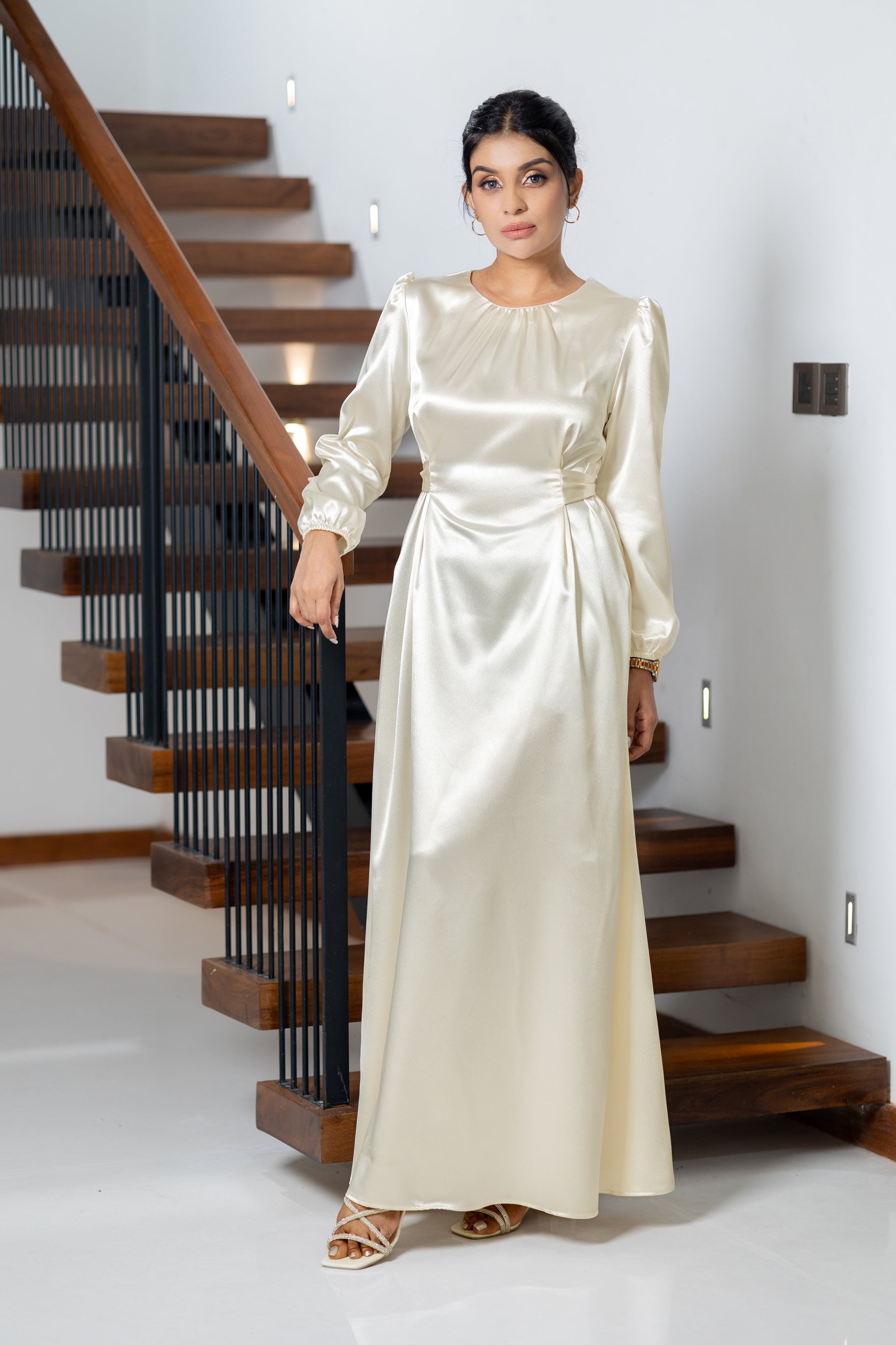 Long ivory coloured maxi dress. 57 inches in length. Satin fabric. The model is wearing UK10