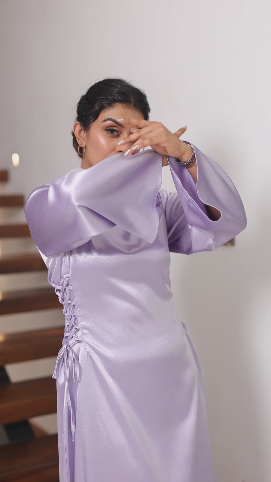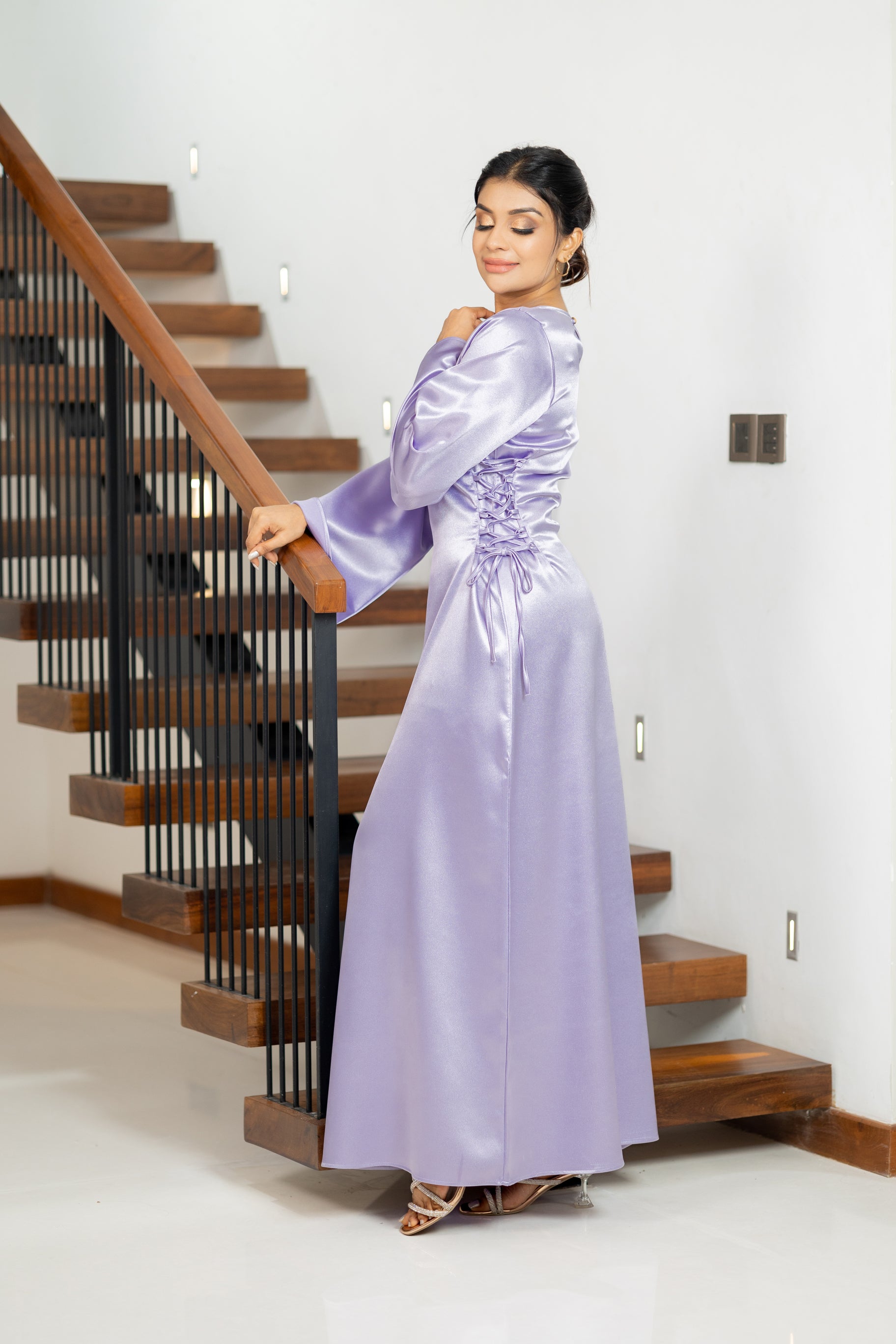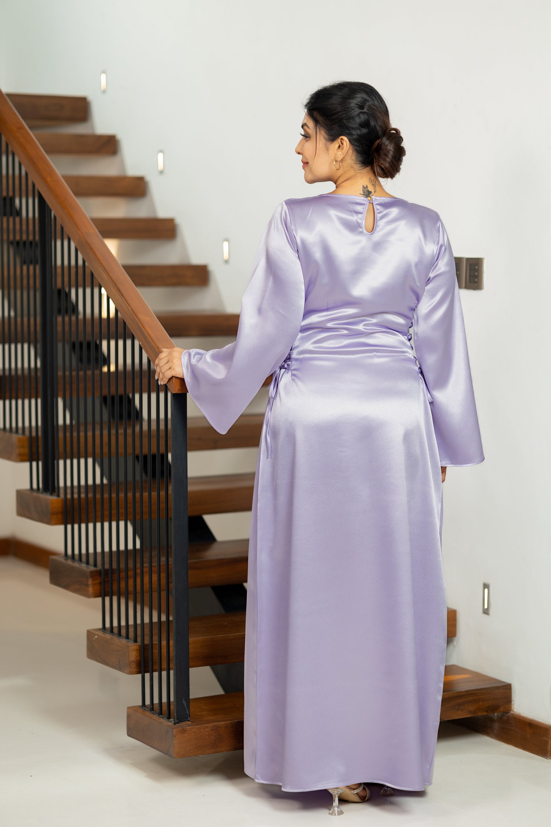 Long Lilac shade dress with side lace-up. 57 inches in length. Satin fabric
