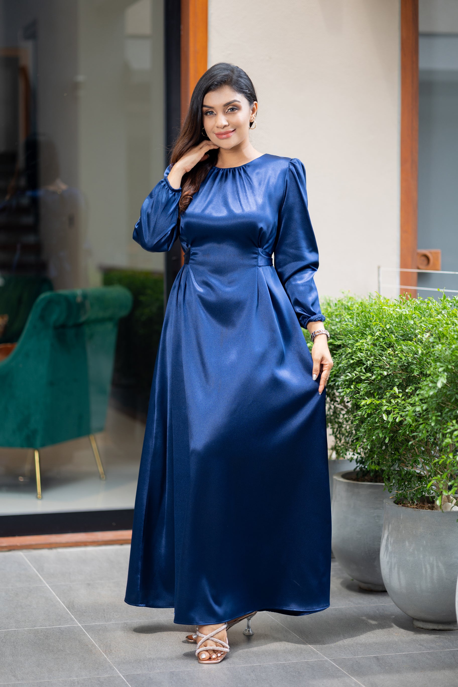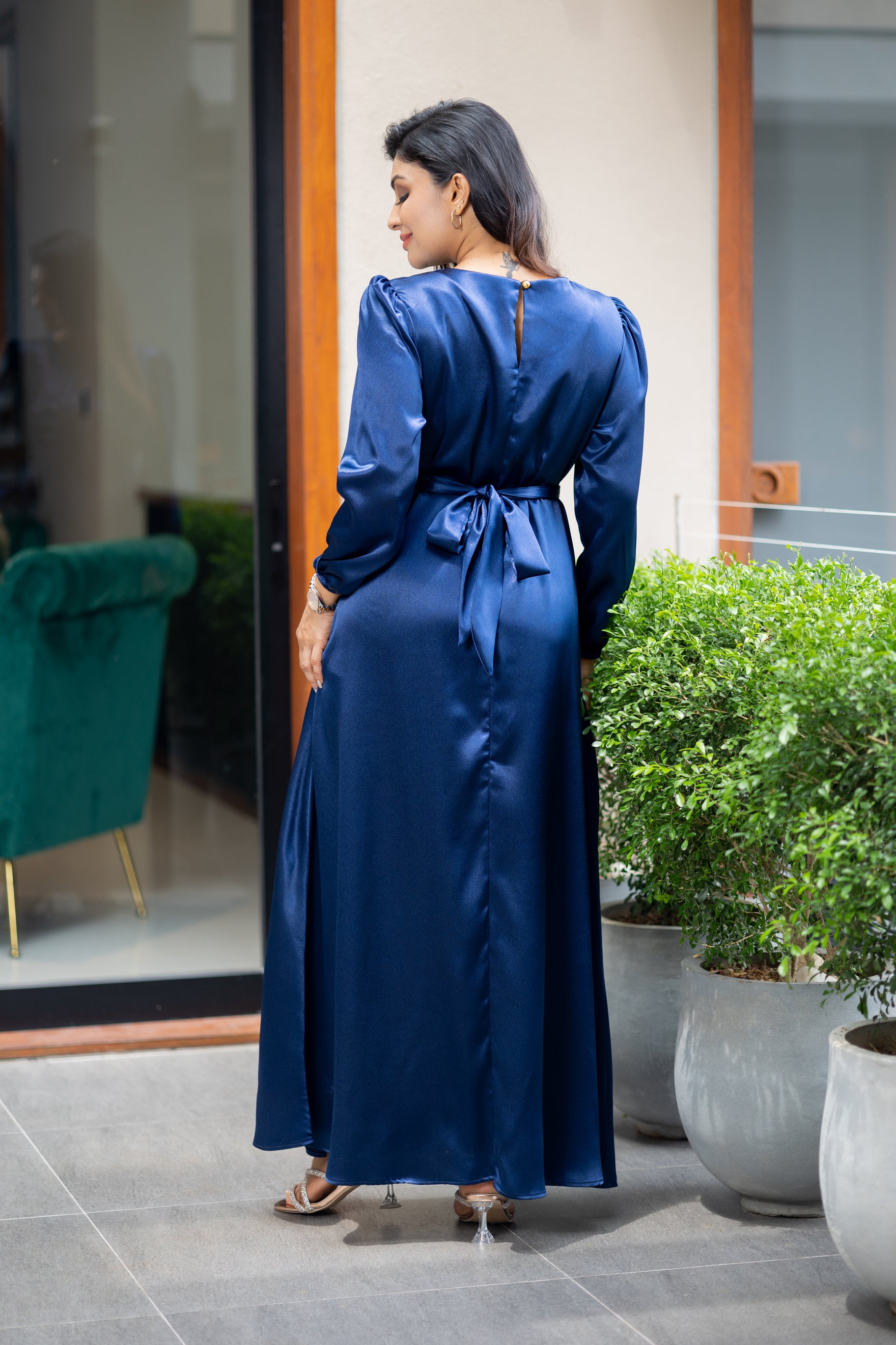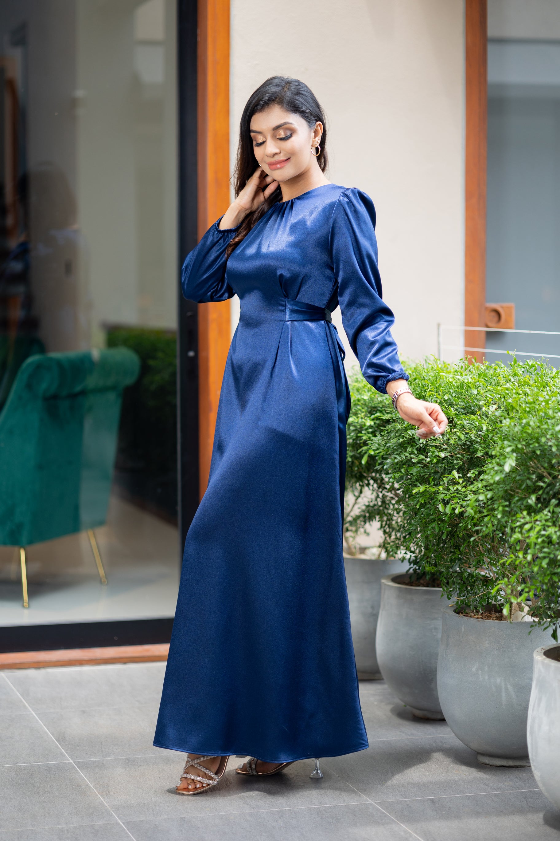 Long midnight blue coloured maxi dress. Satin fabric. 57 inches in length. The model is wearing UK10